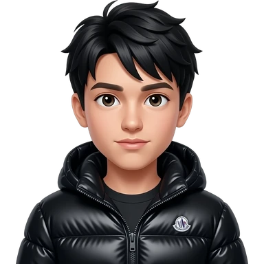 A teenage boy with light skin and diamond face, black short straight messy hair, straight natural eyebrows, dark hunter eyes, medium-big straight nose, soft jawline. Natural lips and smooth skin. Looking directly at the camera. Wearing a shiny black Moncler puffer jacket. emoji