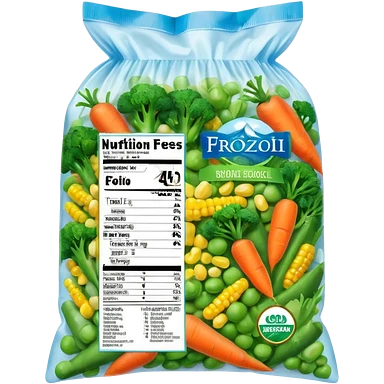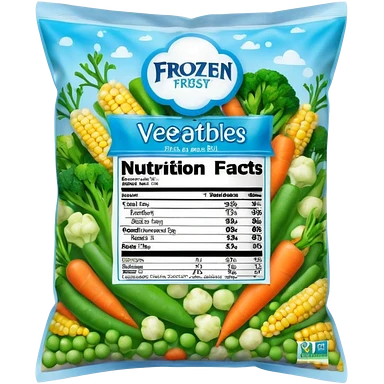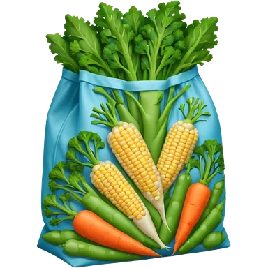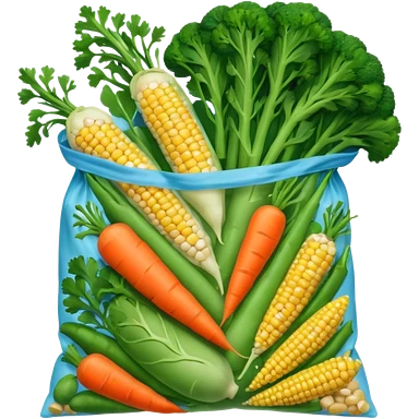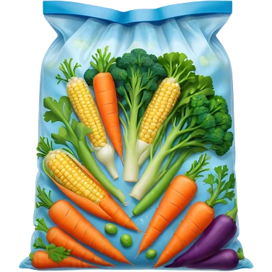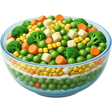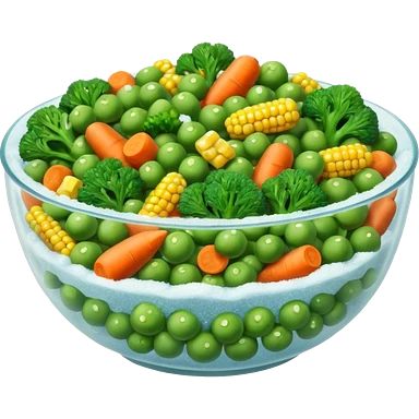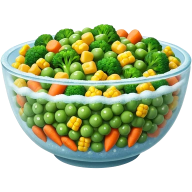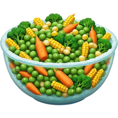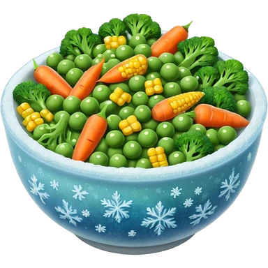 A close-up of a bowl filled with frozen mixed vegetables — peas, carrots, corn, and broccoli — covered with a light layer of frost. The colors are bright but slightly muted from freezing. Natural lighting, high-detail macro food photo. emoji | AI Emoji Generator