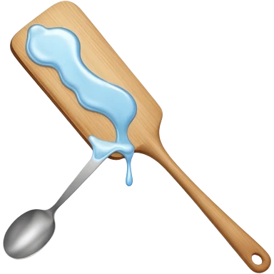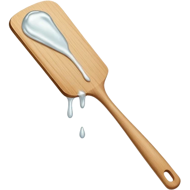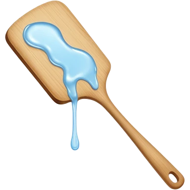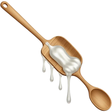 a close-up, minimalist shot of a viscous, pearly substance slowly dripping from a wooden spatula against a neutral gray background. emoji