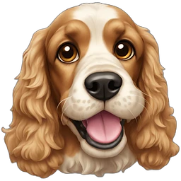 The face of a cute adult cocker spaniel dog, with dark brown ears and back, and golden brown face and chest, with a very happy face emoji
