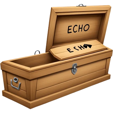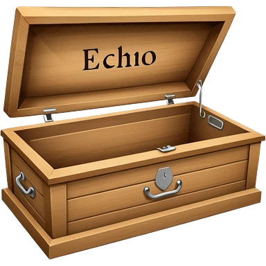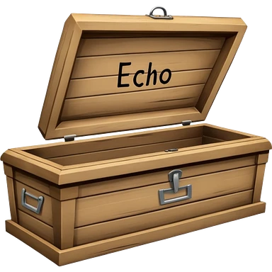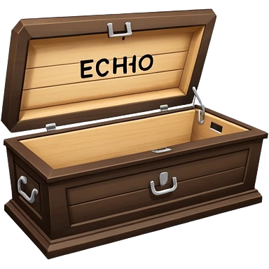Emoji of an empty wooden coffin with its lid on top, the word ‘ECHO’ carved into the lid. The coffin is shown from the outside. A king-like Pepe the Frog, standing outside the coffin, is hammering nails into the lid to seal it shut. No character is inside the coffin. Not a treasure chest. emoji