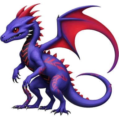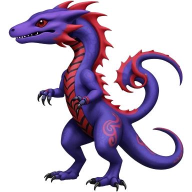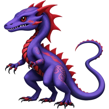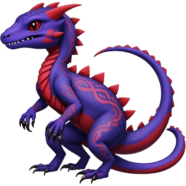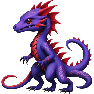 Rare warm-colored exotic gloomy tropical edgy cute epic aesthetic spooky indigo purple white black red gothic colorful Salandit-charmeleon-sergal-species-Fakemon-hybrid-creature, with tribal tattoo markings, full body emoji