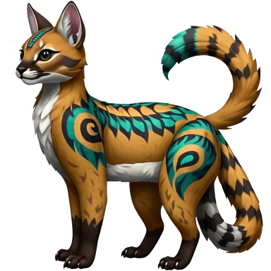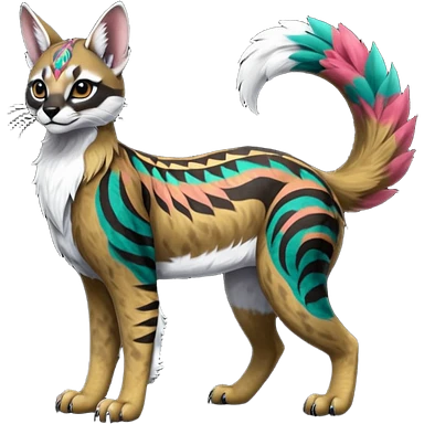 Colorful dark tropical tribal glorious divine exotic cute cool beautiful beautiful fantasy-caracal-civet-genet-sergal-vernid-Gryphon-Cacomistle-Trico-oncilla-animal-Fakémon-hybrid-fursona (full body) emoji