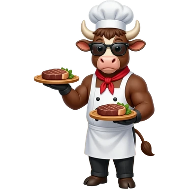 a cool male brown cow with chef hat sunglasses serving you a steak, 3 leg on ground, 1 leg hold the dish emoji | AI Emoji Generator