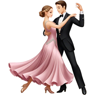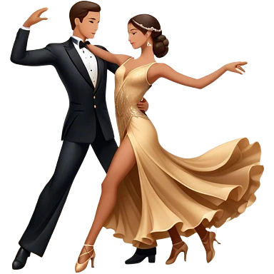 Icon for Ballroom Dancing: a couple in an elegant dance pose, with flowing dresses and tuxedos, surrounded by dance floor lights. The icon should convey the grace and elegance of ballroom dance, with focus on movement and precision. Transparent background. emoji