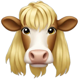 Woman with brown hair long and blonde highlights, bangs in front, blue eyes, white t shirt hugging a cow emoji