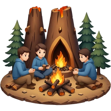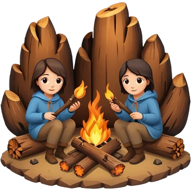 A cozy campfire emoji with two logs and glowing embers, with subtle human silhouettes sitting around. Warm tones, minimal flat emoji style, white background. emoji | AI Emoji Generator