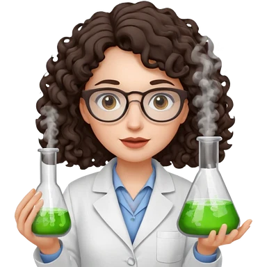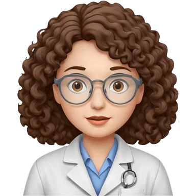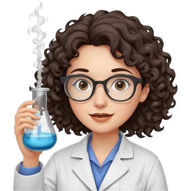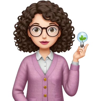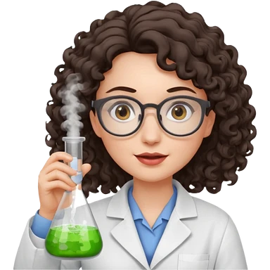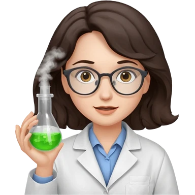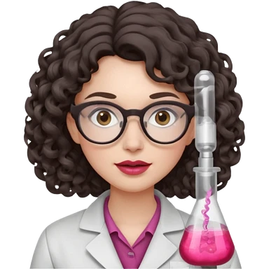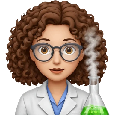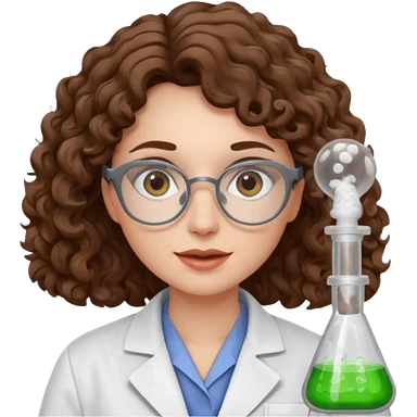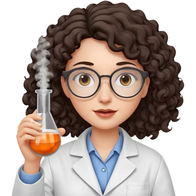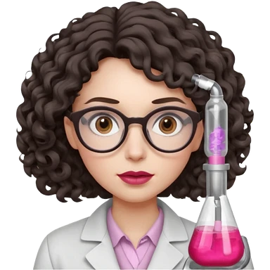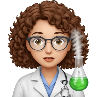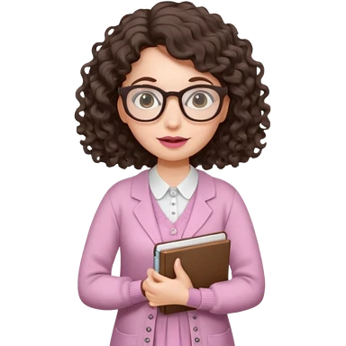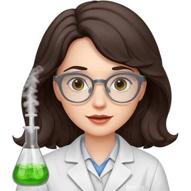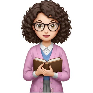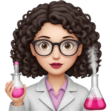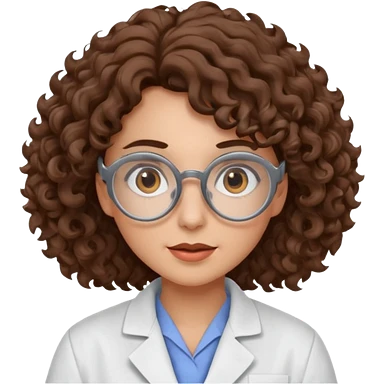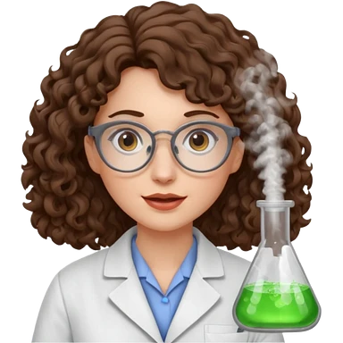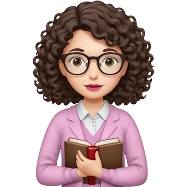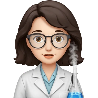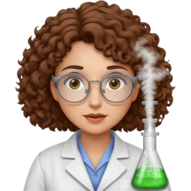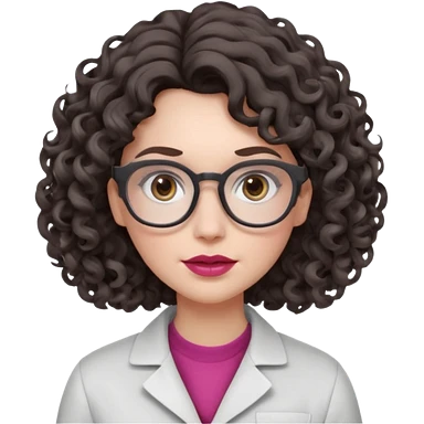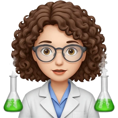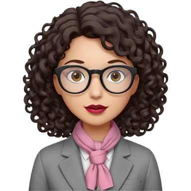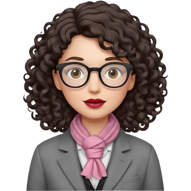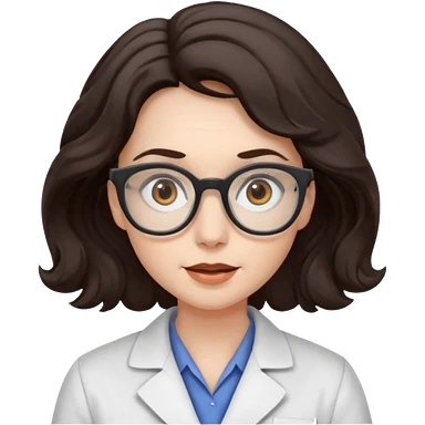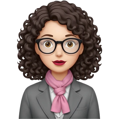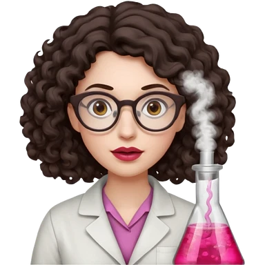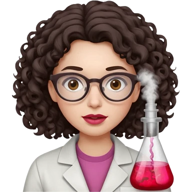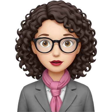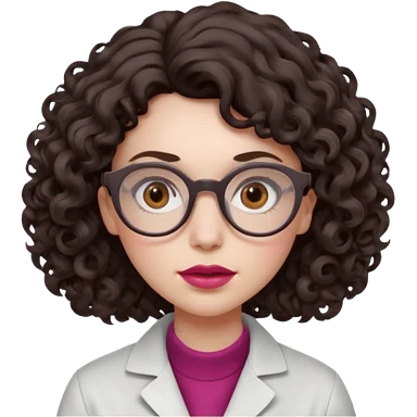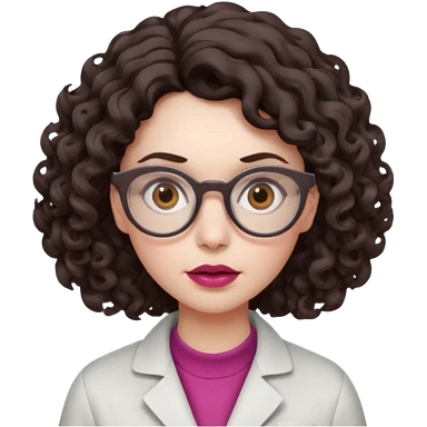 A crazy female scientist, with curly-wavy dark brown medium lenght hair, brown eyes and light grey glasses and pale skin and pinkish lips, dressed to look like an english teacher but in neutral tones like grey black white, maybe with the pop of dark red, with no girly colors, she should look mad emoji | AI Emoji Generator