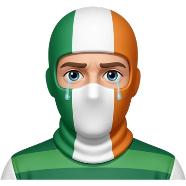 A crying emoji wearing an Irish tricolour balaclava emoji | AI Emoji Generator