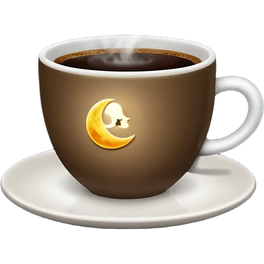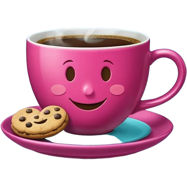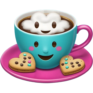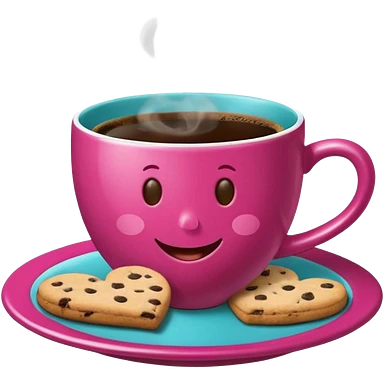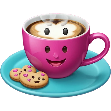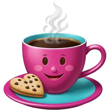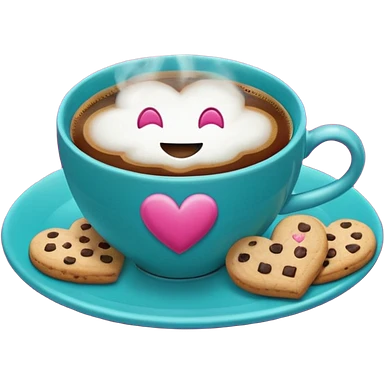 A cup of coffee, steaming, the smoke is heart-shaped, the cup is mustard yellow, the cup has a happy face printed on it, the cup sits on an olive green saucer, and there are cookies around the cup. emoji | AI Emoji Generator