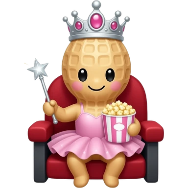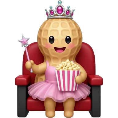 A peanut with a smiling chibi face and pink lips, a princess tiara, a tutu, and a sparkling wand- sitting in the opera box of a theatre holding popcorn emoji