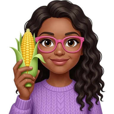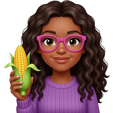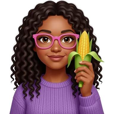 A black light skinned woman with long curly hair and pink glasses, wearing a purple sweater and holding an ear of corn emoji