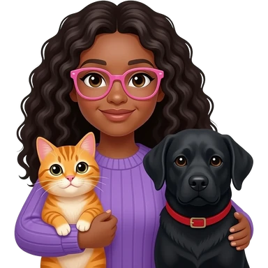 A black light skinned woman with long curly hair and pink glasses, wearing a purple sweater and holding an orange cat and black Labrador dog emoji