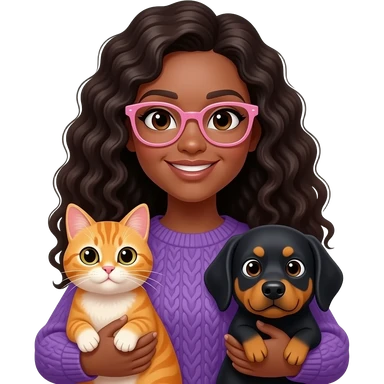 A black light skinned woman with long curly hair and pink glasses, wearing a purple sweater and holding an orange cat and black dog emoji