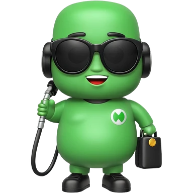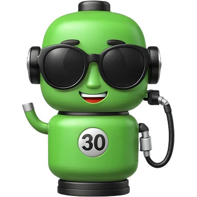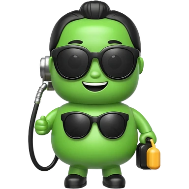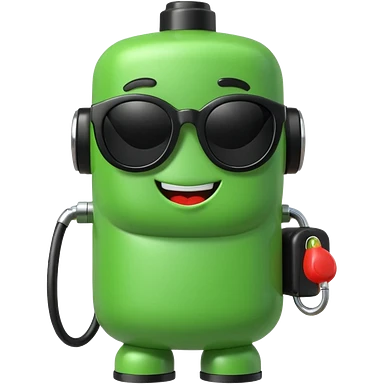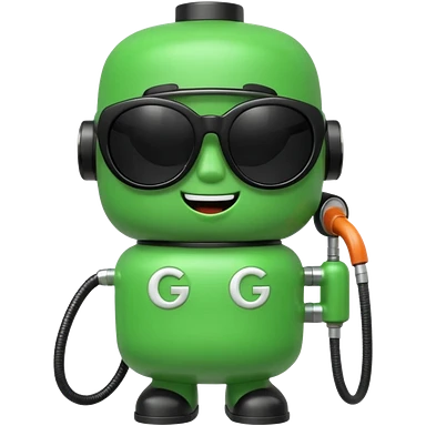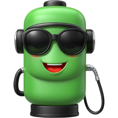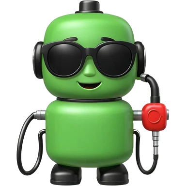 A cute 3D icon of a green gas pump character wearing oversized black sunglasses. Round and chubby proportions, glossy toy-like texture, soft pastel lighting, friendly expression, smooth edges, high-quality render, isolated on a transparent background.emoji