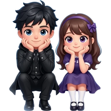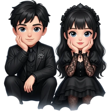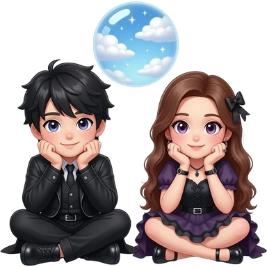 Cute gothic guy and girl sitting next to eachother both eiththere arms on their knees and their chins resting in their hands. With a dreamy bubble in the middle of them filled with magickal clouds emoji