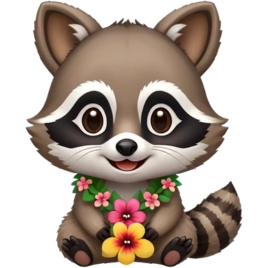 A cute chibi playful raccoon wearing a hawaiian flower necklace, looking festive. emoji