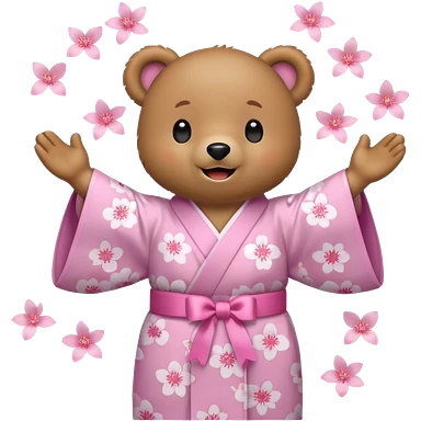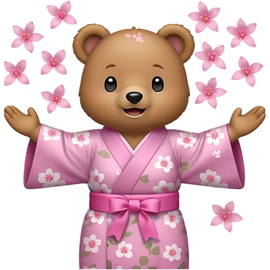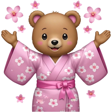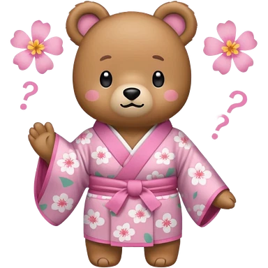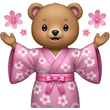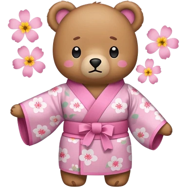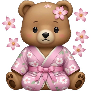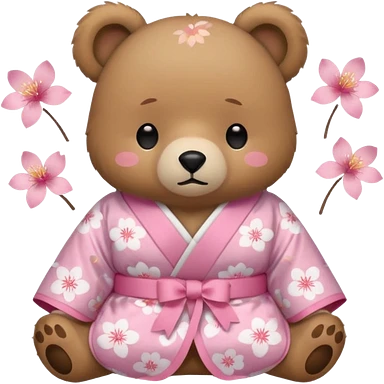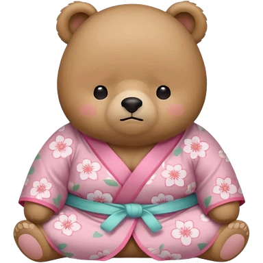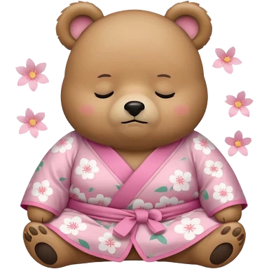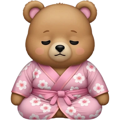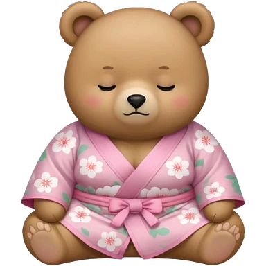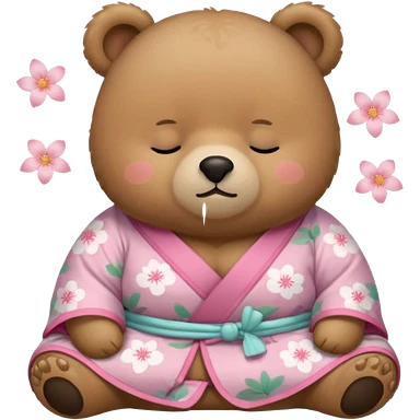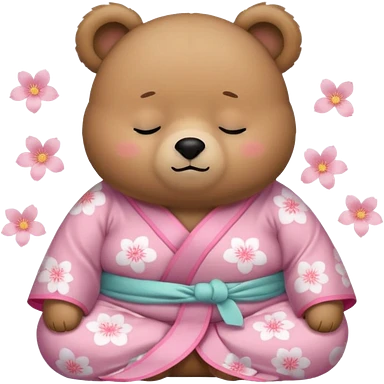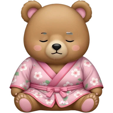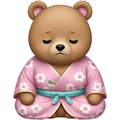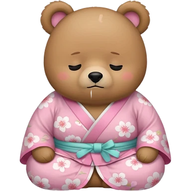 A cute chubby light-brown bear wearing a pastel pink sakura-patterned kimono, tiny body and big round head, adorable simple face, sleepy half-closed eyes, small blush on cheeks, sitting while dozing off, tiny “zzz” floating above the head emoji | AI Emoji Generator