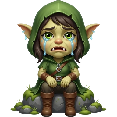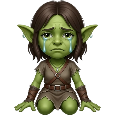 A female goblin who is sitting with little detail and crying emoji