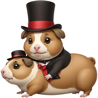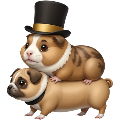 a cute guinea pig wearing a top hat riding on the back of a chubby pug emoji