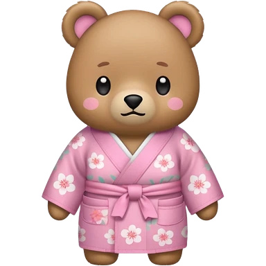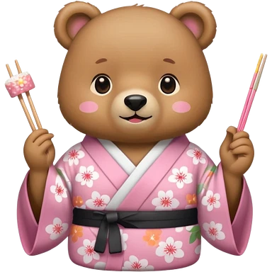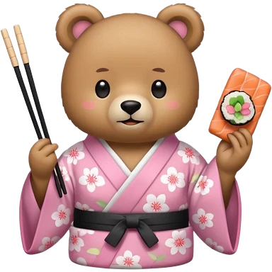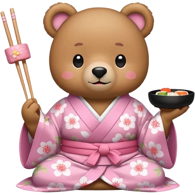 A cute light-brown bear wearing a pastel pink sakura-patterned kimono, normal balanced body ratio. Happily eating sushi with chopsticks, excited sparkling eyes. Kawaii emoji style, minimalistic clean sticker illustration, white background. emoji | AI Emoji Generator