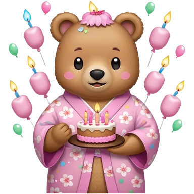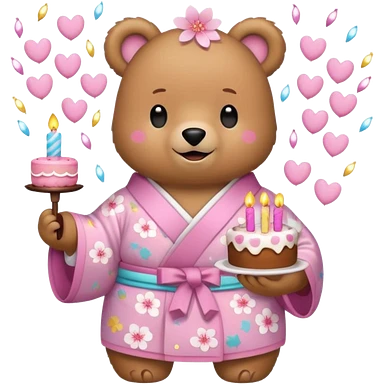 A cute light-brown bear wearing a pastel pink sakura-patterned kimono, normal balanced body ratio. Holding a small birthday cake with candles, smiling brightly with confetti and spark effects around. Kawaii emoji style, minimalistic clean sticker illustration, white background. emoji