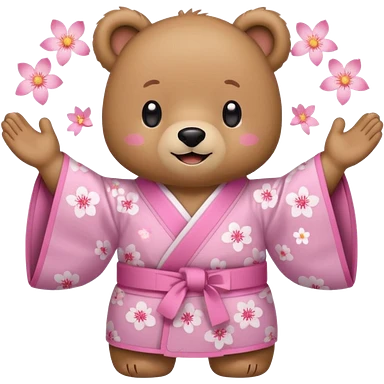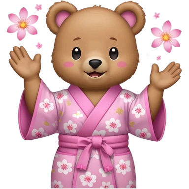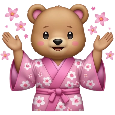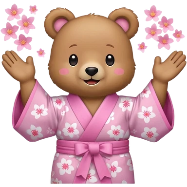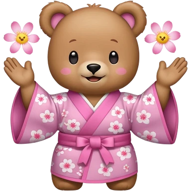 A cute light-brown bear wearing a pastel pink sakura-patterned kimono, normal balanced body ratio. Clapping hands cheerfully with a big bright smile and small spark effects around. Kawaii emoji style, minimalistic clean sticker illustration, white background. emoji