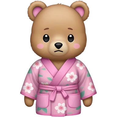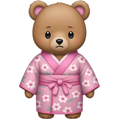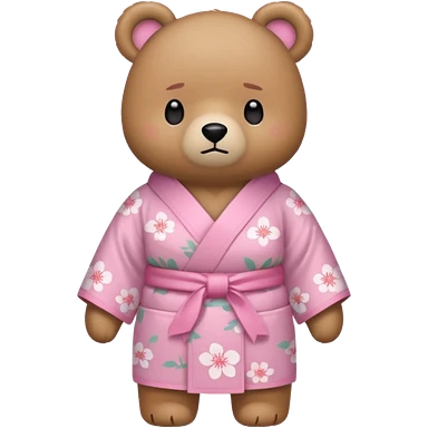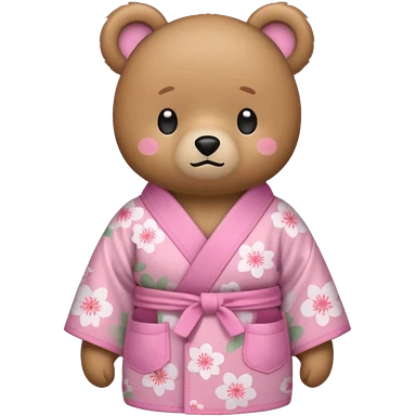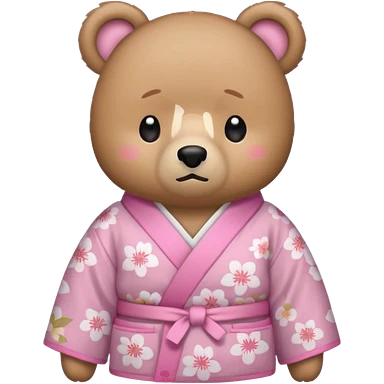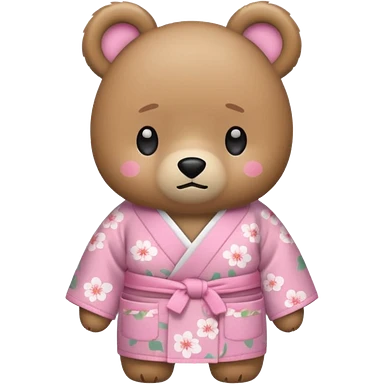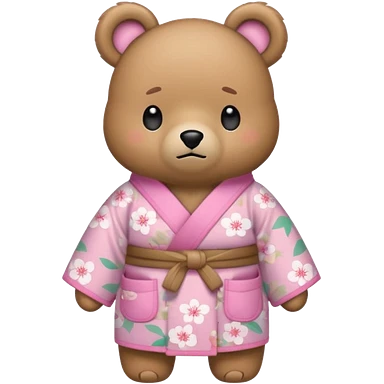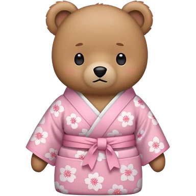 A cute light-brown bear wearing a pastel pink sakura-patterned kimono, normal balanced body ratio. Tilting head slightly with a confused face, a big floating question mark above the head. Kawaii emoji style, minimalistic clean sticker illustration, white background. emoji