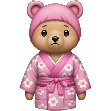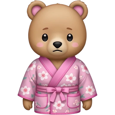 A cute light-brown bear wearing a pastel pink sakura-patterned kimono, normal balanced body ratio. Arms crossed with a slight pout, daring “wanna get scolded?” expression. Kawaii emoji style, minimalistic clean sticker illustration, white background. emoji