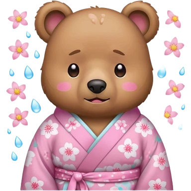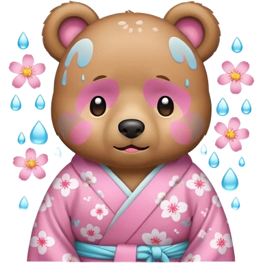 A cute light-brown bear wearing a pastel pink sakura-patterned kimono, normal balanced body ratio. Crying heavily with big teardrops streaming down the face, trembling lips and watery eyes. Kawaii emoji style, minimalistic clean sticker illustration, white background. emoji