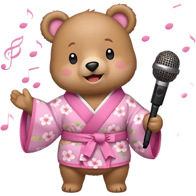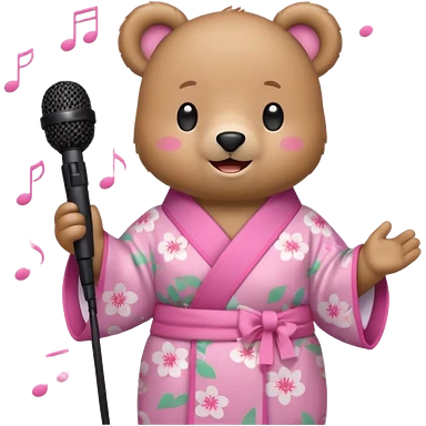 A cute light-brown bear wearing a pastel pink sakura-patterned kimono, normal balanced body ratio. Holding a microphone and singing happily, music notes floating around and a bright joyful smile. Kawaii emoji style, minimalistic clean sticker illustration, white background. emoji