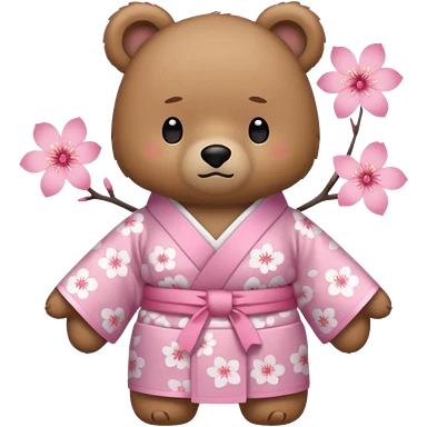 A cute light-brown bear wearing a pastel pink sakura-patterned kimono, normal balanced body ratio. Standing under a blooming sakura tree, looking up at falling pink petals with a soft amazed smile. Kawaii emoji style, minimalistic clean sticker illustration, simple scenic background. emoji