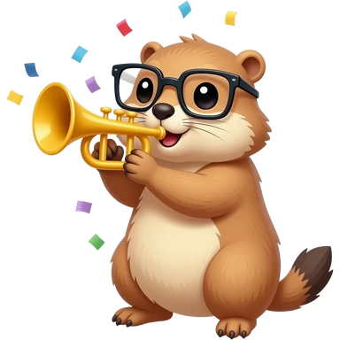 A cute prairie dog with square Glasses blowing on a party horn with confetti all around emoji | AI Emoji Generator