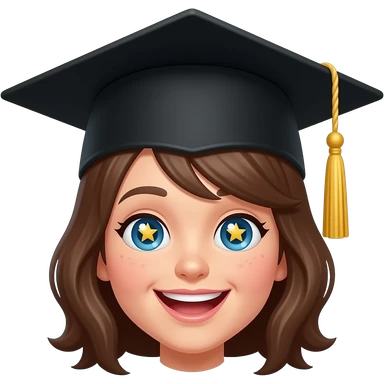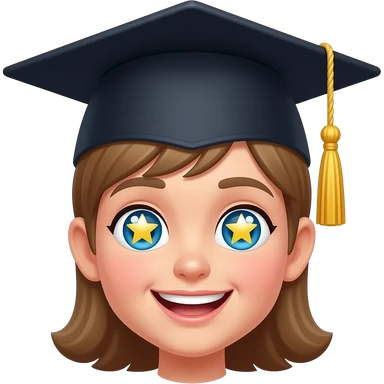 A cute 🤩 star-struck emoji character wearing a graduation cap (mortarboard) on top of its head, the cap is slightly tilted, gold tassel hanging down, bright cheerful expression with star-shaped eyes sparkling, cartoon style, vibrant colors, white background, high quality illustration emoji | AI Emoji Generator