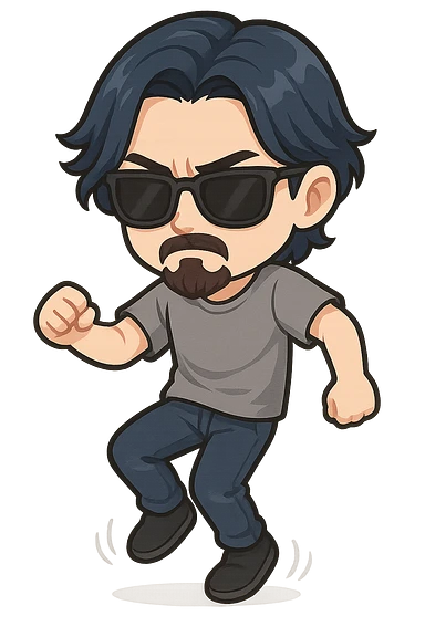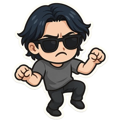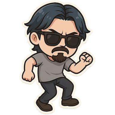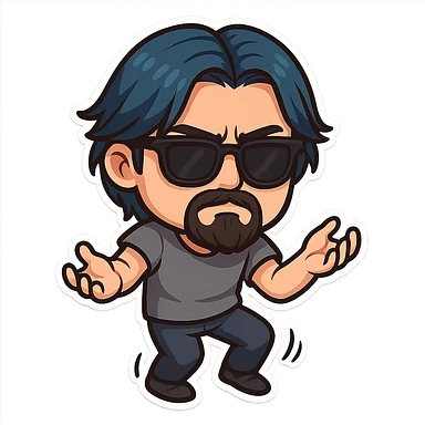 a dark brooding hipster with electric dark blue hair, surfer middle part, chin length hair, classic neat trimmed bushy goatee, black classic rayban shades, plain gray t-shirt, doing the gimmie dance, maniac dance, 1980's dance emoji | AI Emoji Generator