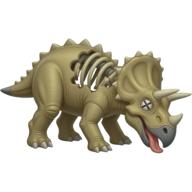 a triceratops that has fallen down. It has been chewed up and has visible ribs and x's over its eye, with its tongue hanging out emoji