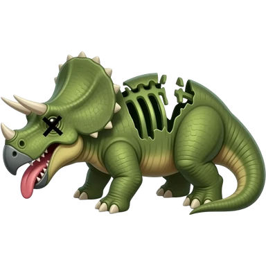 a dark green triceratops that has fallen over. It has been chewed up and has visible ribs and x's over its eye, with its tongue hanging out emoji | AI Emoji Generator