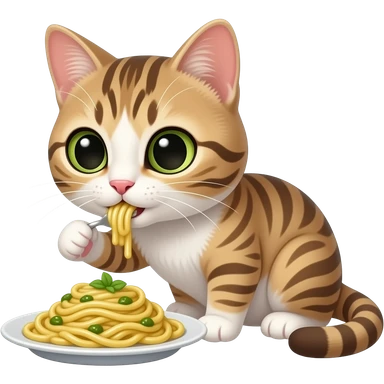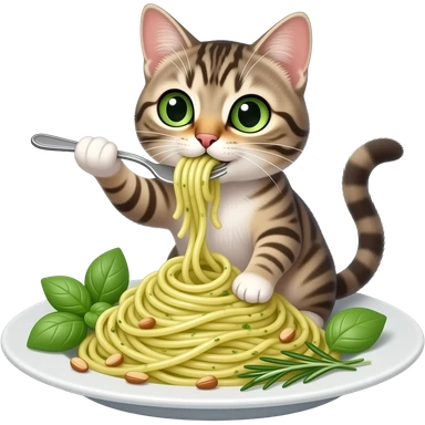 a deli delicious pesto pasta being eaten by a tiny cat emoji