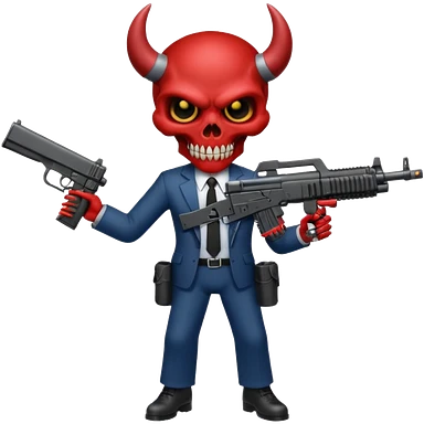 A Demon from hell that is dressed like a fbi agent with a machine gun, full body pointing the machine fun to the left. In the style of your bleeding skull artwork. Just one machine gun emoji