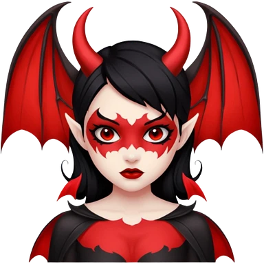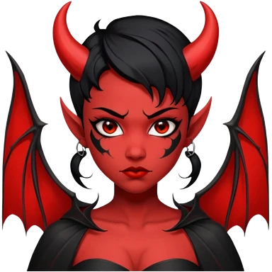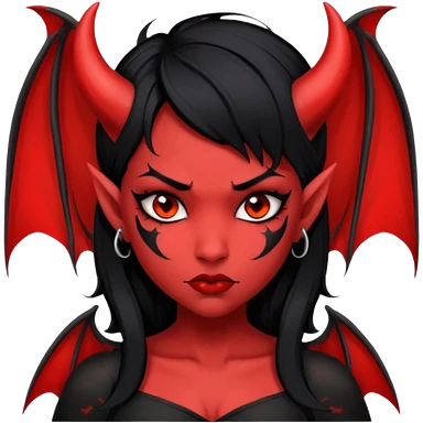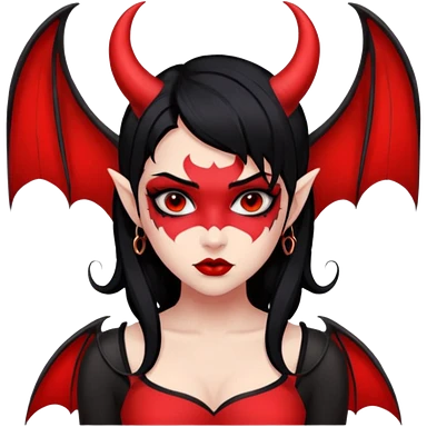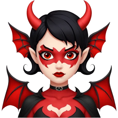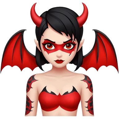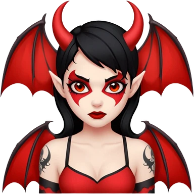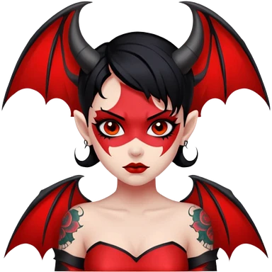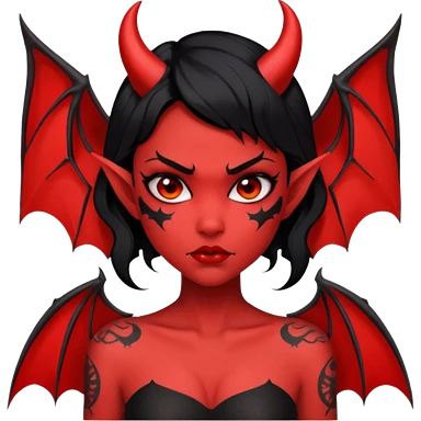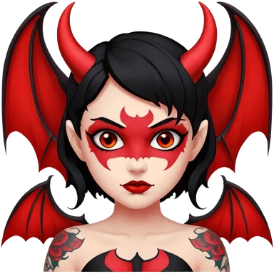 Demon girl: red skin, black hair, small horns, bat wing; tattoo-flash comic style; red/black palette; bold outlines; dark background; no text. emoji