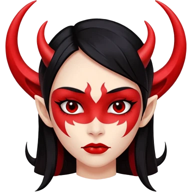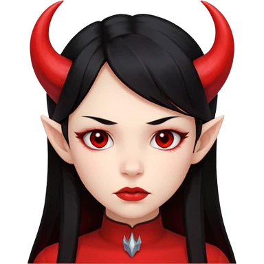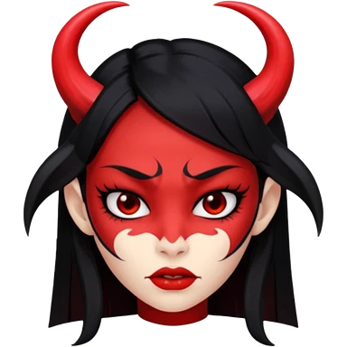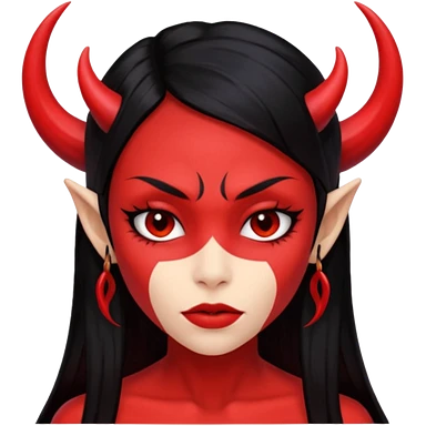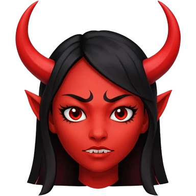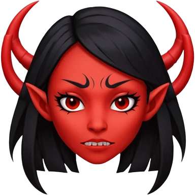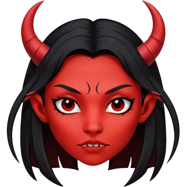 Head only demon girl; face with pronounced cheekbones and angular jaw; skin is uniform pure red (#FF0000) everywhere; long straight smooth black hair; small horns emoji