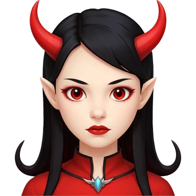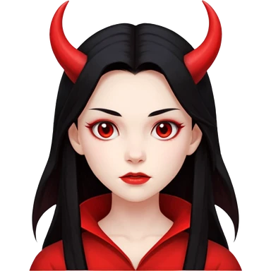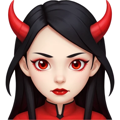 Woman with porcelain white skin, black lips, thick blonde hair that's in a thick long ponytail, a black nose, yellow scleras, red pupils, and a red suit with a black tie. Demon emoji