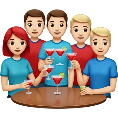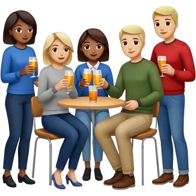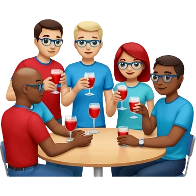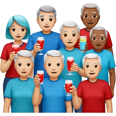 Two dozen adults in casual clothing with red, aqua and blue shirts with different drinks chatting at an afterwork meeting emoji