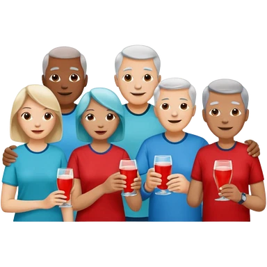 A room packed with adults and seniors in casual clothing with red, aqua and blue shirts, some with drinks, chatting at an afterwork meeting emoji