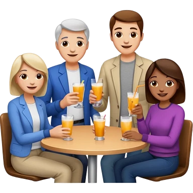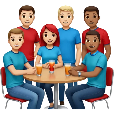 Ten adults in casual clothing with red, aqua and blue shirts, some with drinks chatting at an afterwork meeting emoji