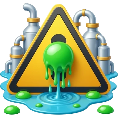 A detailed photograph of a yellow triangular warning sign with a black border, featuring a dripping black sphere.