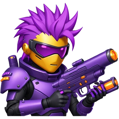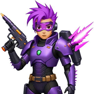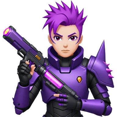 A space bounty hunter with spiky purple hair, black armored suit, and a glowing plasma gun. emoji