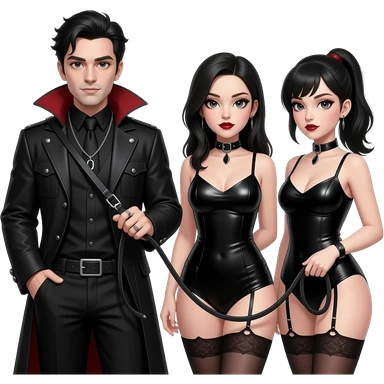 Gothic man holding a black leather leash that is attached to two gothic submissive womans neckleash emoji