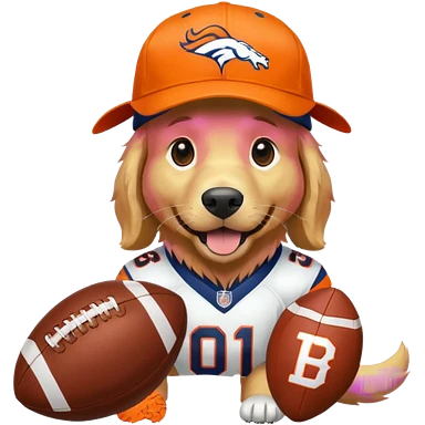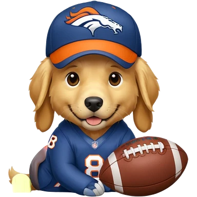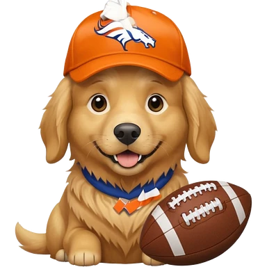 Dog wearing a Broncos hat it’s a golden retriever. The dog is holding a football. emoji