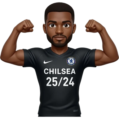Black man with goatee double arm flex wearing Chelsea 25/26 black jersey emoji